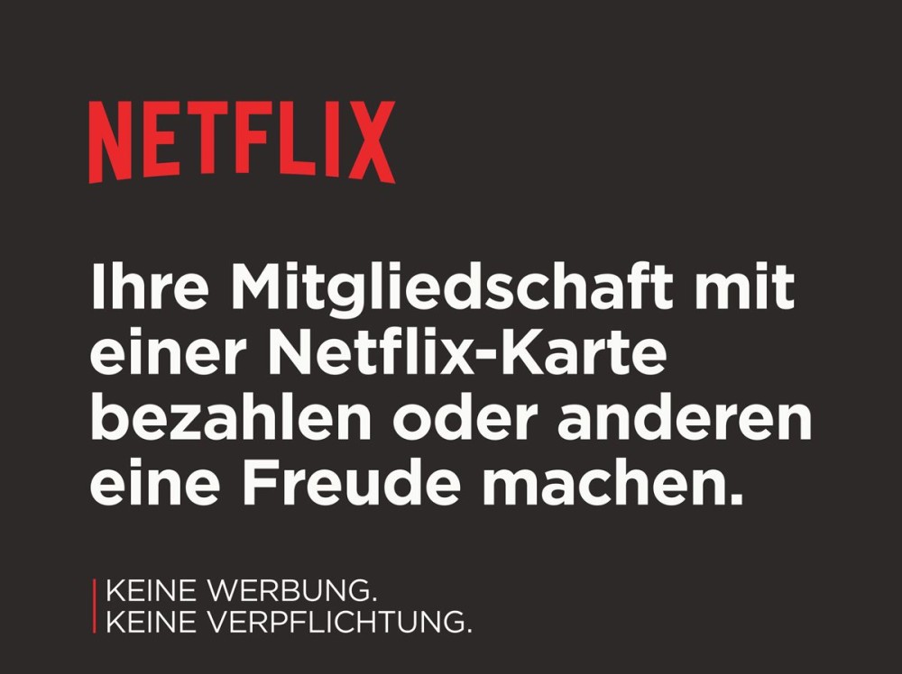 Die Netflix-Geschenkkarten können zur Bezahlung jeder Abo-Stufe von Netflix verwendet werden. Es ist keine Kreditkarte oder andere Zahlungsart erforderlich. Damit also ein schönes Geschenk, oder auch verwendbar um ein eigenes Netflix-Abo zu bezahlen.
